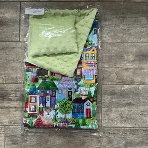 Hand made, 100% cotton on exterior and bubbly minky fabric inside bag and pillow, has zipper on side of bag.