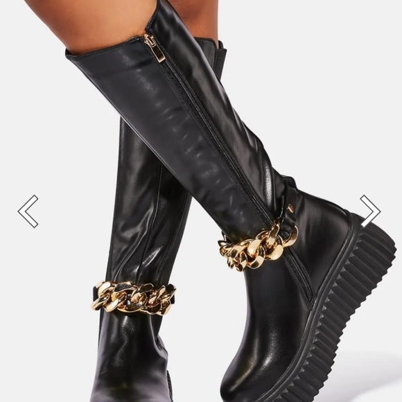 AZALEA WANG I Don't Wanna Be Like You Platform Boots from Dolls Kill have a vegan leather construction, a knee-high shaft, elastic side paneling, zipper closures, chain link detailing, and platform soles. Price Firm.