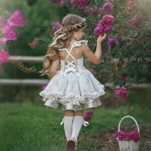 The skirt is super bouncy and sits beautifully naturally. Featuring an elasticated floral back bodice for a comfortable fit with frilled tie shoulder straps that can be looped through the back bodice loops for a criss-cross look.