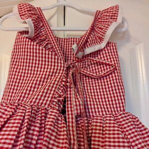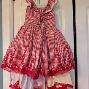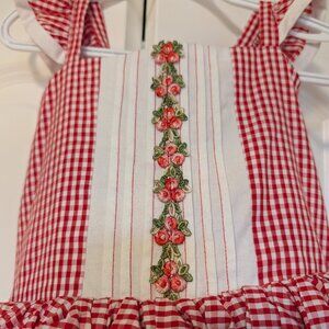 Beautiful Dollcake brand Jill dress, red gingham dress with floral touch and red matching bloomers. Criss-cross shoulder tie straps. Excellent condition. Size 8.