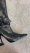 Pre-owned pair of black patent leather knee-high boots. Features a pointed toe, stiletto heel, and side zipper closure. Materials: Patent leather. Features: Pointed toe, side zipper, decorative bow