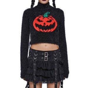 Dolls Kill Halloween Pumpkin cropped black fuzzy sweater (S-M)