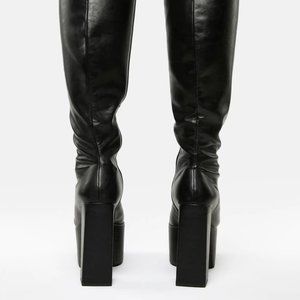 Lamoda Wide Calf Obsession Knee High Boots have a vegan leather construction, a wide calf, block heels, thick platforms, and side zip closures.