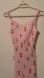 Chic pink knit dress. Features red heart accents. Spaghetti straps. Perfect for casual outings.