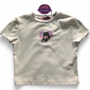 •Y2K inspired Bratz Jade white ruffle hem flame graphic rhinestone crop top Kool Kat by Dolls Kill 💄🔥