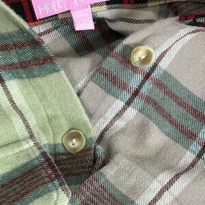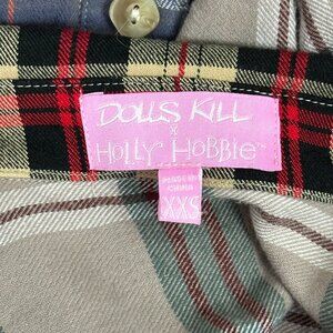 Dolls Kill x Holly Hobbie Mixed Plaid Flannel Shirt. Assorted patterns and colours of plaid. Oversized relaxed fit. Could probably fit an XS or S for a less oversized fit. Two large front pockets with flap close. Square buttons with rounded edges. Materials: 100% Cotton. No known flaws.