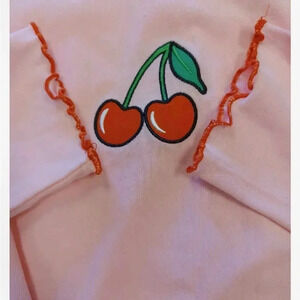 Bubble gum pink with cherries this long sleeve features a round neck. Cuffs and waistband have red detailing.