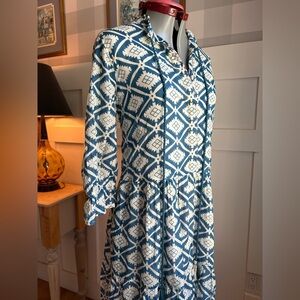 Step out in style with this elegant blue and white patterned dress. Perfect for any occasion, this dress offers a comfortable fit and a chic look.