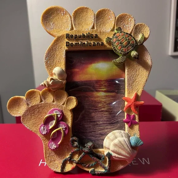 Charming beach-themed photo frame with seashells and a turtle. Features 'Republica Dominicana' text. Perfect for vacation memories.