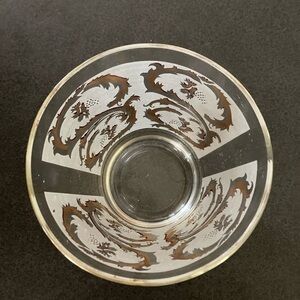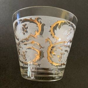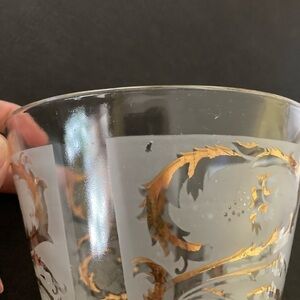 Dominion Frosted glass with Gold scroll ice bucket. MCM Excellent vintage shape. Approx 5.25 in. tall and 5.75 in. across. In excellent vintage shape. Please note the one small spot of missing frost.
