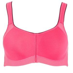 Zoe Pro Max Support sports bra from Dominique. Get in the game with support and confidence. Slip-free supportive straps and wide wings create the ultimate stay-put fit for high-impact workouts. Specifically designed to reduce bounce and manage moisture. Converts from standard to racerback with a J-hook. Features encapsulated, lightly lined cups and a tall front for containment and support. Wide, padded straps adjust in back. Hook-and-eye back closure. In EUC, no flaws! Colour is pink with black contrast edging around neckline, straps and top back edge. Size 38DD.