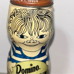 Set of two Domino Sugar 'N Cinnamon shakers with playful character designs. Features cream, blue, yellow, and brown colors.