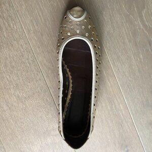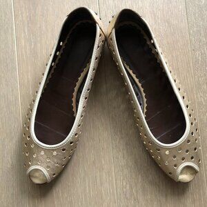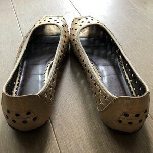 Donald J Pliner Peep Toe Flats in Metallic Matte Gold with all-over circle cut out pattern