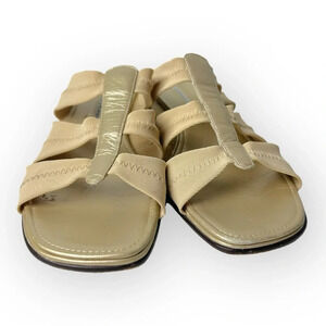 Elevate your summer look with these stylish slip-on sandals by Donald J Pliner. The gold synthetic upper material and 2 inch, mid-heel height make them perfect for any occasion. Featuring a slip-on closure, these sandals are easy to wear and comfortable on the feet.