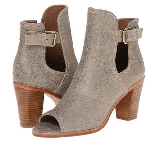 Peep-toe ankle boot featuring instep zipper and cutout lateral side with buckle strap