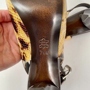 Stunning pair of peeptoe slingbacks in an espresso and tan patent snakeskin leather. The padded footbed makes these so comfortable -- even with a 4 inch heel! Beautifully made shoes that will take any outfit to the next level.