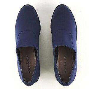 Excellent pre-owned condition, Donald Pliner women's Cape wedge platform slip on loafer in a soft stretch blue and black wedge sole, size 7.5M.