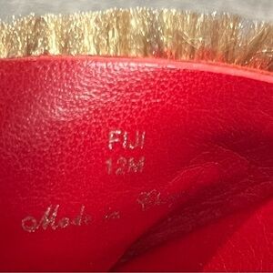 Donald Pliner red leather wedge sandals. Size 12, wedge heel is 2 inches. There is 1 small scuff on op of toe bed, a seen in photos. Slip on, hidden toe thong on a cushioned foot bed, handmade sole.