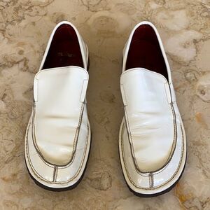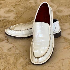 This season’s hottest colour, white! In very good preowned condition Donald J. Pliner white patent leather slip in loafers feature a clean line, light Vibram soles and a comfortable 1” heel. Leather lined, made in Italy.