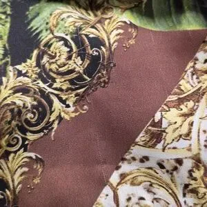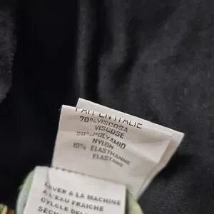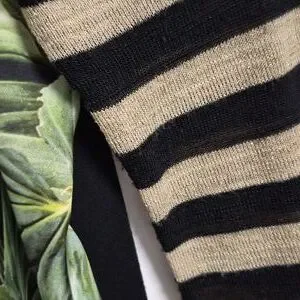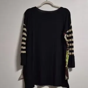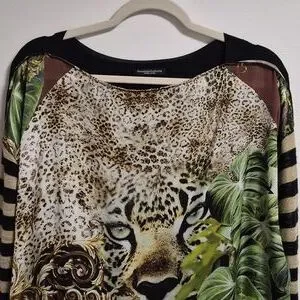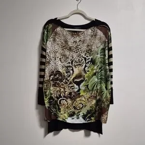 Jungle print viscose top with a knit striped sleeve in black and metalic gold. It has a jersey back and has side splits. High/low design. Loose tunic fit. There are a few runs in the near the bottom. Not very noticeable when it's on or if you have took the top into a pair of pants. Italian brand and made in Italy. Pit to pit is approximately 23.4" and length is 27" in the front and 29.5" in the back.