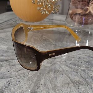 Karan, Donna, the daughter of a tailor, designed clothes when as a teenager and studied at New York's Parsons School of Design. In 1985 Karan launched her first collection under her own name and five years later added a ready-to-wear line, DKNY. She became known for comfortable yet elegant apparel made particularly for professional women. DKNY logo is engraved on both temples. Honey color, vintage