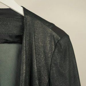 This jacket from Donna Karan New York is made in a black shimmery leather, and is adorned with tonal jersey panels on the sides, sleeves, and shoulders. It features long sleeves, an open draped front with satin lining, and front draped pockets.