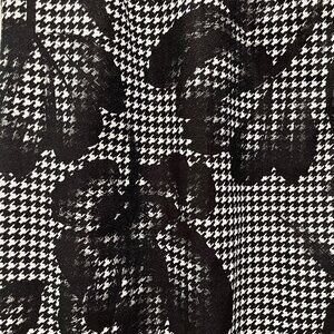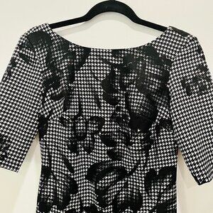 Stunning Houndstooth Flora Sheath dress from Donna Ricco in excellent like new condition, no flaws. Beautiful painted black floral pattern overlay on top of the houndstooth base pattern with an elegant V neck back. Would make a gorgeous outfit for a wedding or other formal event. Perfect mix of classy and sexy!
