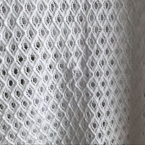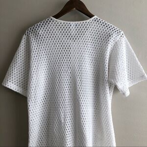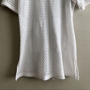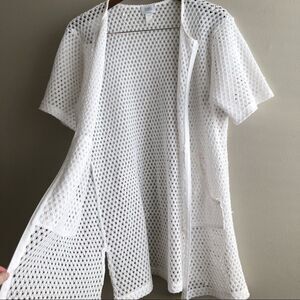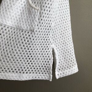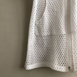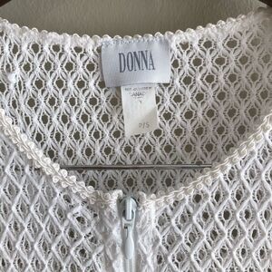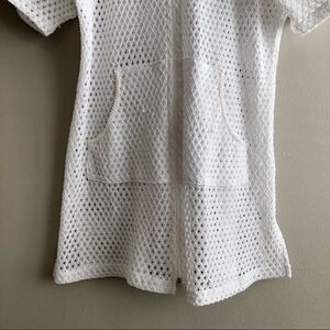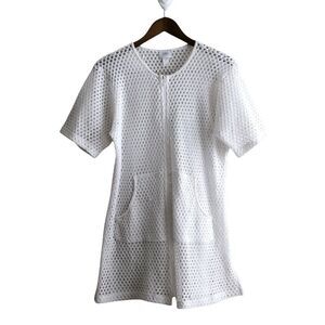Vintage Donna full mesh/lace zip-up beach/swim cover-up in white. Short sleeves, relaxed fit, and front pockets. Lightweight rayon/poly blend — perfect for pool or resort wear.