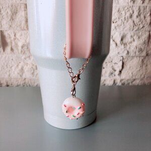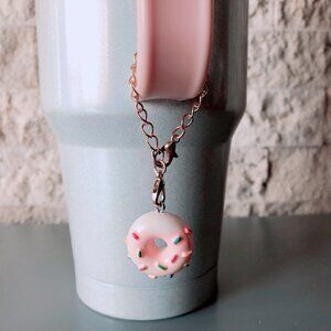 Cutest little donut charm to hang off your Stanley or other tumbler. Hook closure so it can easily be attached to a zipper tag on a purse, pouch or makeup bag. A unique idea to customize your tumblers!!