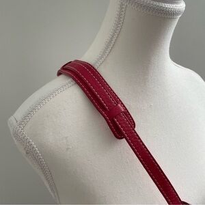 Dooney & Bourke Dillen Letter Carrier Letter Crossbody Bag Strawberry Pink. Adjustable crossbody strap. Double pouch zipper closure. Inner key hook. Good used condition, has a minor scratch on the front you can see in the picture but not super noticeable.