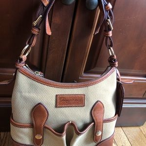 Brown leather and fabric Dooney & Bourke handbag. Has a few organizational pockets on the inside. In very good condition!