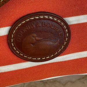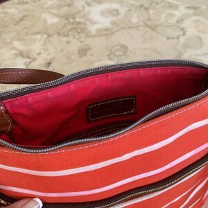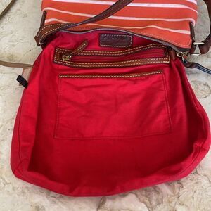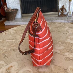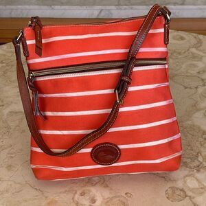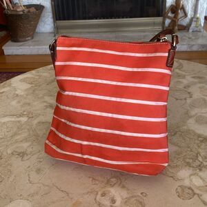 Authentic Dooney & Bourke shoulder bag featuring a colourful canvas exterior, striped white and reddish orange, leather brand plaque, adjustable leather strap and leather zipper pulls.