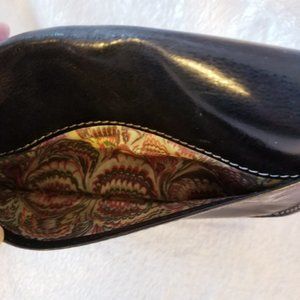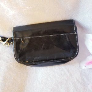 Vintage Dooney & Bourke wristlet in very good condition. Interior clean, lined with Satin paisley print. Snap closure. Shiny high quality leather in good shape, some minor marks from usage but not very noticeable (please see pictures). Back has an open slip pouch. Marks on the front logo plate, see picture. Removable wristlet attachment. Lobster claw closure device.