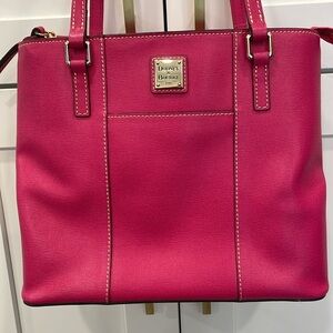 Dooney & Bourke pink coated saffiano leather tote bag. Two shoulder straps, two small exterior slip pockets, zipper closure, gold toned hardware, red fabric lined interior with multiple smaller pockets inside. Good pre owned condition with some marks on the interior fabric. Please see photos, measurements are for reference only. Reasonable offers welcome!