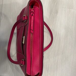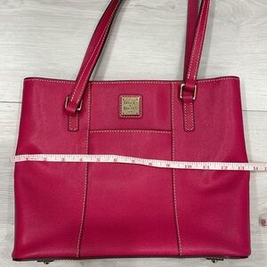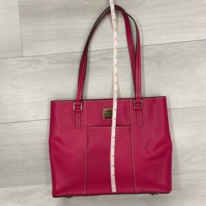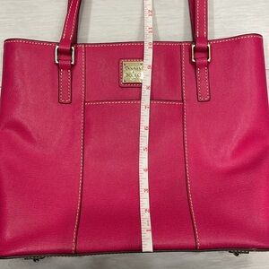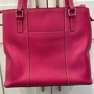Dooney & Bourke pink coated saffiano leather tote bag. Two shoulder straps, two small exterior slip pockets, zipper closure, gold toned hardware, red fabric lined interior with multiple smaller pockets inside. Good pre owned condition with some marks on the interior fabric. Please see photos, measurements are for reference only. Reasonable offers welcome!