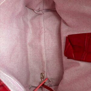Red leather hobo/shoulder bag in pebbled print that can be worn over the shoulder (shoulder strap is detachable). Snap button closure with a large spacious interior, red/white patterned lining, and champagne hardware. Interior has a large zipper pocket on one side and a small accessories pocket on the other side. Two zippered compartments on the front of the bag.