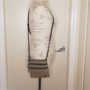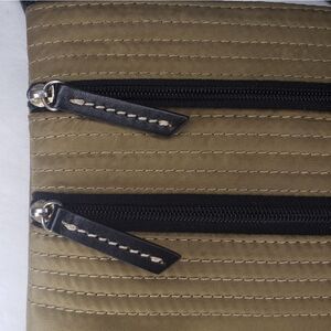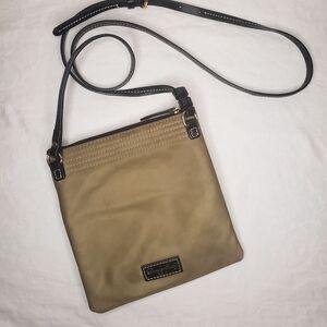 Classic Tan Canvas triple Zippered Cross-body Purse with hot Pink Lining, by DOONEY and BOURKE.