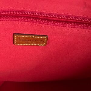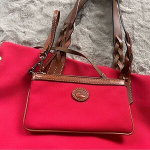 Canvas red Dooney tote bag with matching detachable wristlet pouch . Beautiful brown leather trimming including leather braided shoulder straps. In overall excellent condition, with some minor wear to the corners. Width 18 inches, length 12 inches