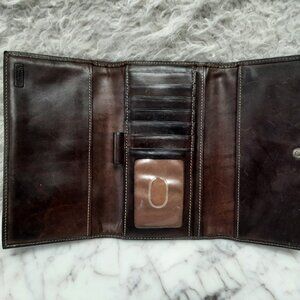 Check out this Dooney Bourke Wallet Brown Canvas Leather Trifold Checkbook Organizer Clutch in pre-owned condition, some darken stains on canvas but no rips on it, the lining has some wear inside the change compartment but the leather lining still in great shape.