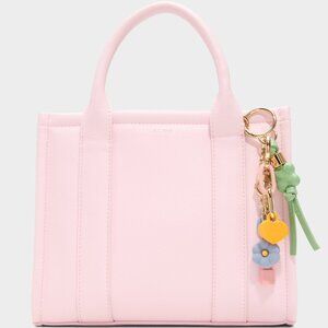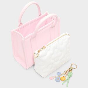 Pillow-soft marshmallow-pink panels frame this petite tote, with clean vertical seams and a flower-and-heart charm that adds playful mood as you go about your day, from morning coffee to sunset strolls. Carry it with linen pants for cafe mornings, or sling it with a sundress and sandals for outdoor dining.