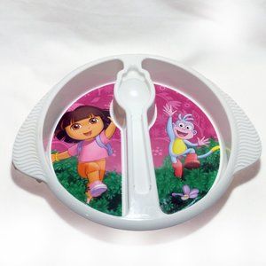 Dora The Explorer With Her Monkey Boots- Sectional Plate 3 Piece Set-Set Includes-Hard Plastic Plate With 2 Sections, 1 Spoon & 1Fork. Plate Is app. 9.75" Including Side Handles.