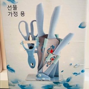 Doraemon kitchen set , includes 3 knives , peeler, scissors, cutting board and stand.