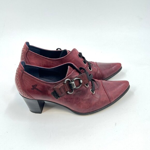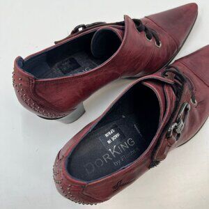 Brand: Dorking by Fluchos, made in Spain, wine red like, pointy style, metal embossed details back of heel, great quality. Good pre-owned condition.