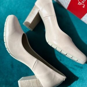 This blush colour is the perfect pairing for any occasion. The toe on this shoe is classic and withstand the test of time. Leather upper, block heel, rubber outsole and Made in Spain.