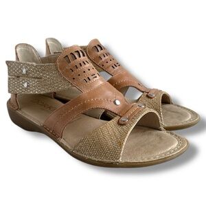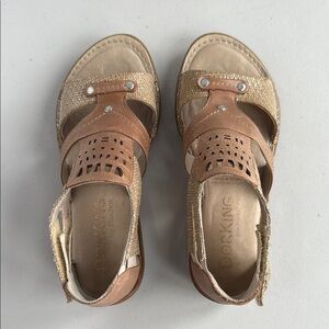 These Dorking by Fluchos tan sandals feature a gladiator-inspired design with a velcro ankle closure. Crafted for comfort, they have a flat sole with slight cushioning and decorative perforations for added style. Perfect for warm weather, these sandals offer a versatile and casual look.
