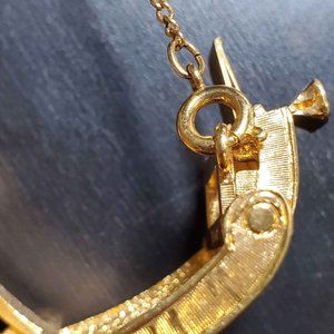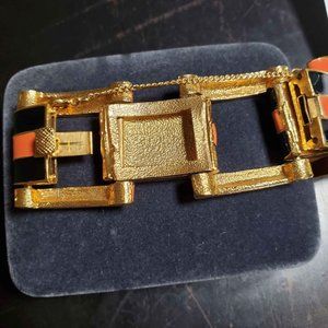 Approximately 1.23’’ wide and 7 inches long. Safety chain is present and gold tone plating in excellent condition. Slide in clasp with sides of clasp in black and orange enamel.