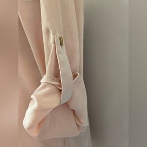 Pink/ rise gold blouse with a mandarin collar, optional roll tab sleeves and gold buttons.