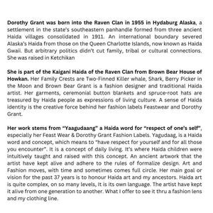 Dorothy Grant is an award winning, renowned designer. She was born into the Raven Clan in 1955 in Hydaburg Alaska, a settlement in the state's southeastern panhandle formed from three ancient Haida villages consolidated in 1911. An international boundary severed Alaska's Haida from those on the Queen Charlotte Islands, now known as Haida