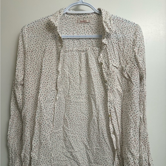 Chic blouse with ruffle details and dotted pattern. Perfect for any occasion.