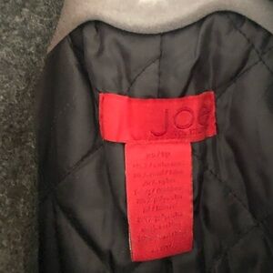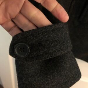 This double breasted dark gray peacock coat button up with collar clasp is in very good condition. The material tag is hard to read, but is 80% wool and 20% nylon lining is quilted polyester. Please see measurements and pictures can fit a small medium reads extra small.